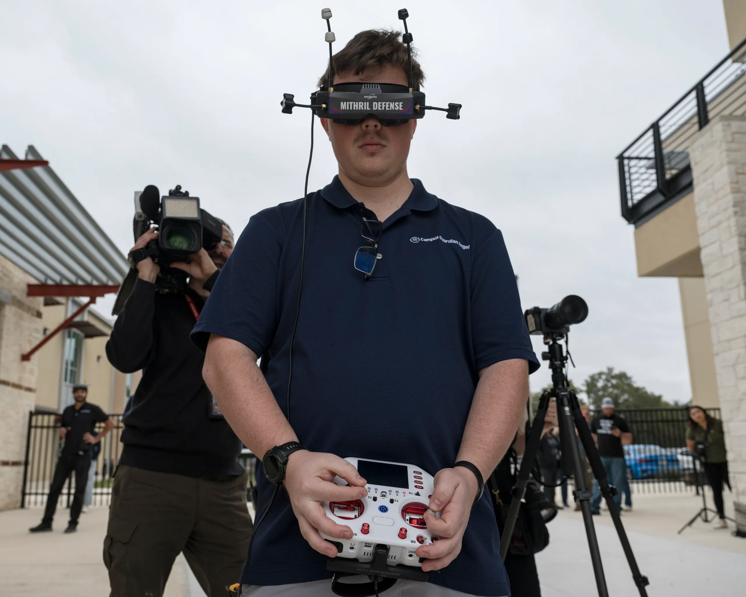 Campus Guardian Angel pilot Mason “Hyper” Lively pilots a drone during a demonstration of the company’s proposed on-site safety response capability aimed to respond to active shooters in schools, at Champion High School in Boerne on Friday, Jan. 9, 2026. Eli Hartman for The Texas Tribune