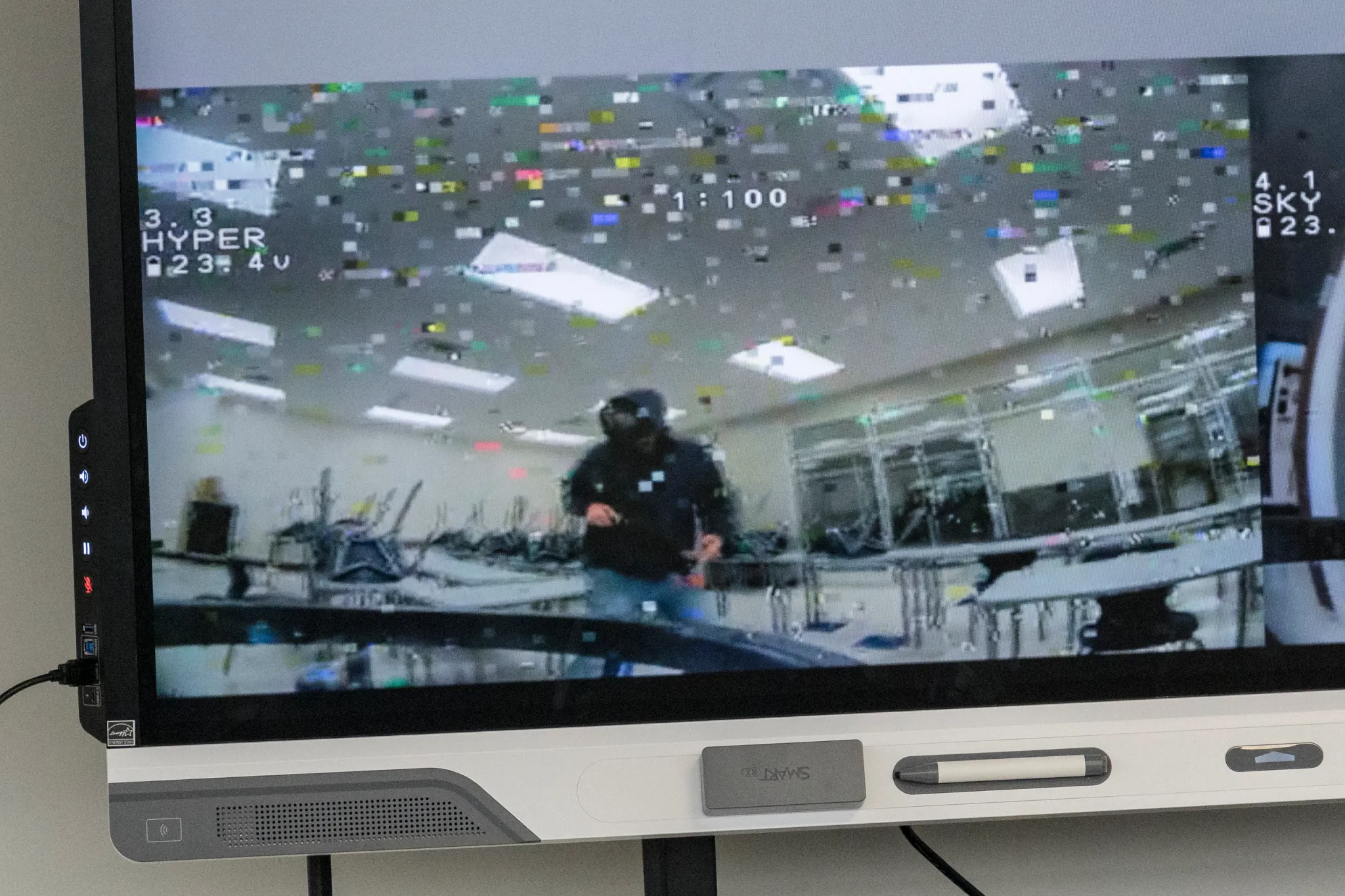 Live video feed from a drone showcases the hypothetical surrender of an active shooter during a demonstration of Campus Guardian Angel at Champion High School in Boerne. Eli Hartman for The Texas Tribune